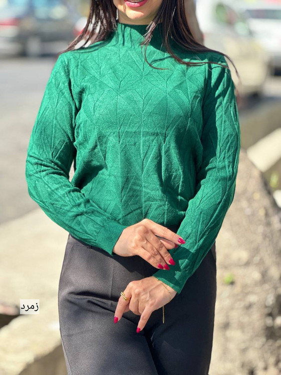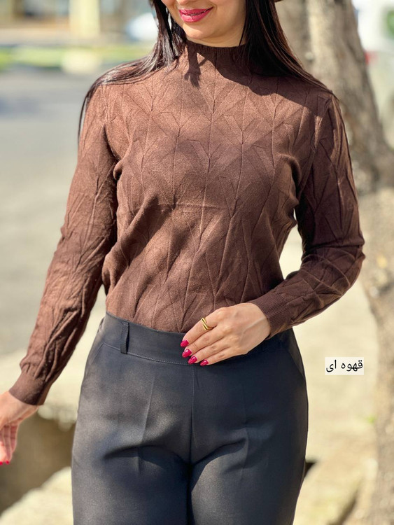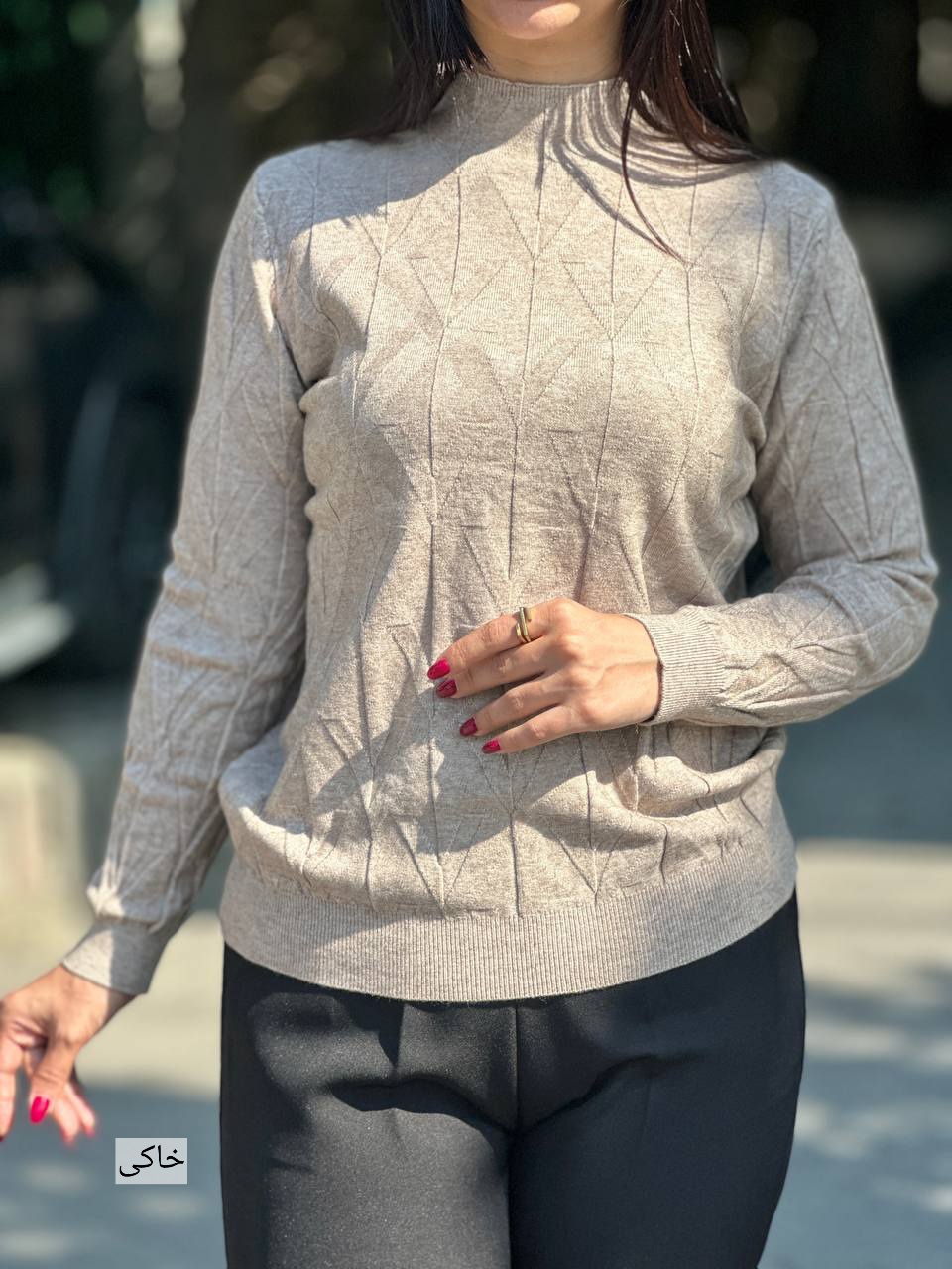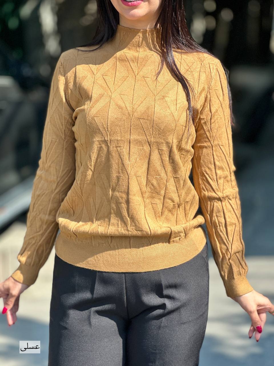 بافت زنانه لوین با یقه ایستاده و طرح لوزی برجسته. لطیف، خوشفرم و مناسب استایل روزمره و مهمانی. انتخاب شیک برای پاییز و زمستان.
